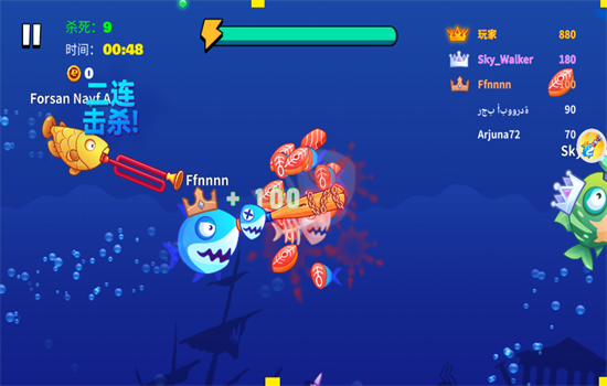 在游戏中,玩家需要操控一条鱼,与其他鱼群进行战斗。