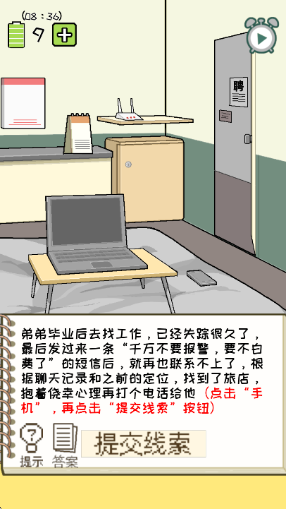剧情推进解谜:游戏围绕两大章节的剧情展开,玩家需通过观察动画、阅读文字提示来寻找正确线索。比如在营救主人公弟弟的章节中,依据聊天记录、定位信息等线索,像点击“手机”并提交线索这样的操作推动剧情发展,逐步解开谜题、破获案件。