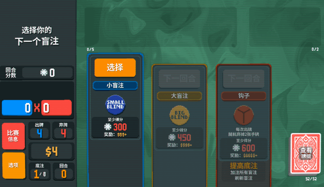 2、你的目标是组建强大的扑克手牌来击败Boss盲注。