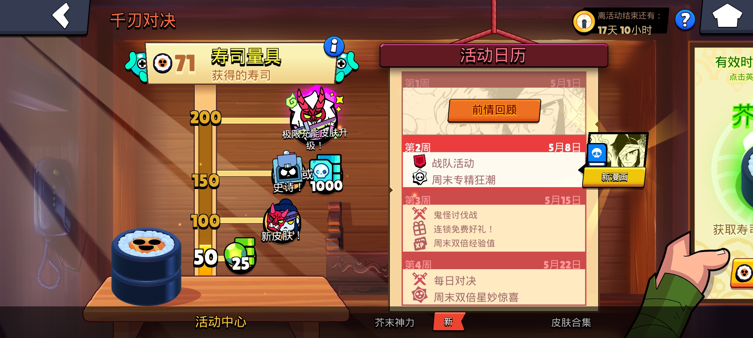 我们向右看,依次是三种货币:星光点数、金币、宝石。星光点数主要是对高杯玩家的奖励,既可以在赛季末兑换宝箱,还可以购买专属星光皮肤;金币用处很广,除皮肤外的大多数购买都是以他为媒介;宝石自不必说,是最具购买力的货币,宝石归零的我流下了贫穷的泪水。