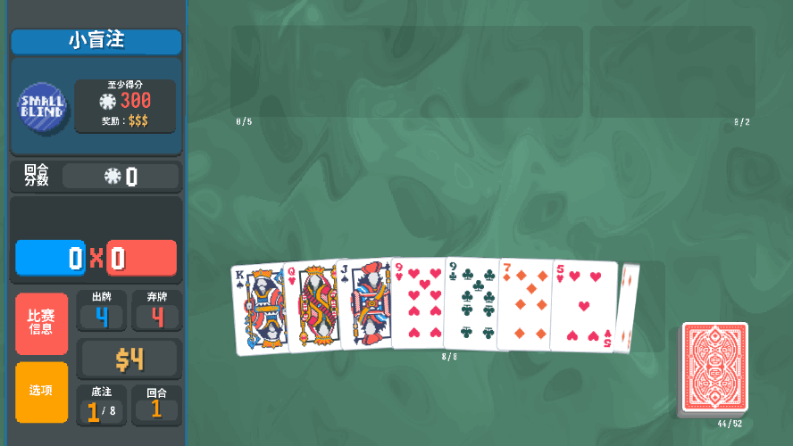 4、选好后会随机发给玩家不同的扑克牌来使用,打出各种牌型来获得分数,当分数到达关卡要求就可以通关。