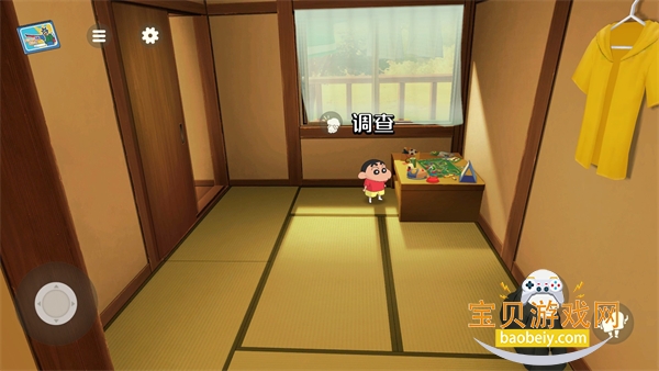使用虚拟摇杆控制小新移动,点击场景中的物品或人物进行互动,通过界面按钮使用工具或打开菜单