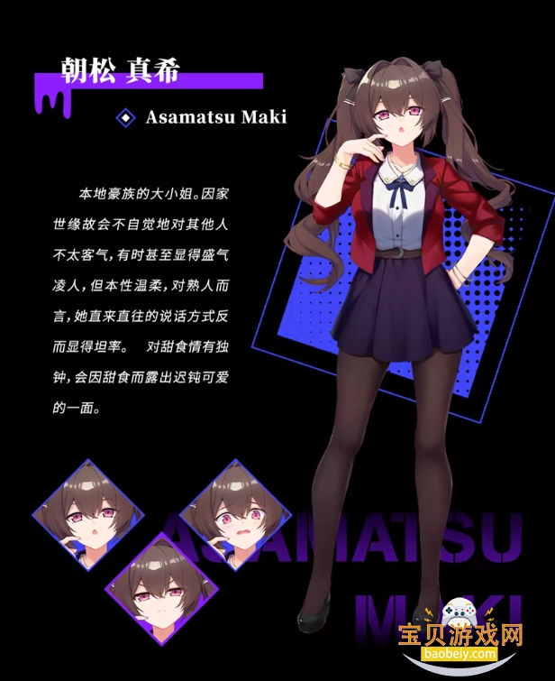 本地豪族的大小姐。因家世缘故会不自觉地对其他人不太客气,有时甚至显得盛气凌人,但本性温柔,对熟人而言,她直来直往的说话方式反而显得坦率。对甜食情有独钟,会因甜食而露出迟钝可爱的一面。