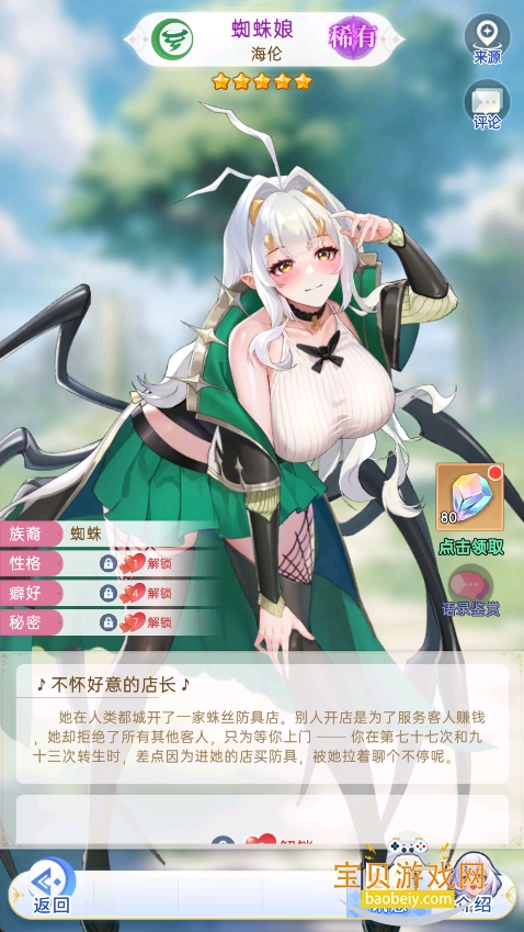 她在人类都城开了一家蛛丝防具店。别人开店是为了服务客人赚钱她却拒绝了所有其他客人,只为等你上门--你在第七十七次和九十三次转生时,差点因为进她的店买防具,被她拉着聊个不停呢。