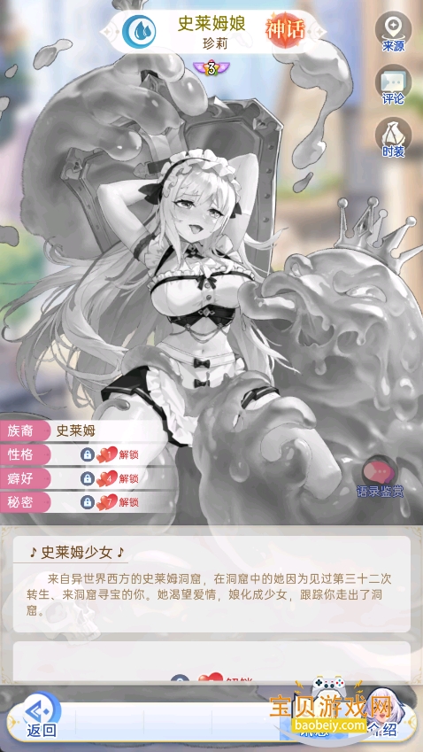 来自异世界西方的史莱姆洞窟,在洞窟中的她因为见过第三十二次转生、来洞窟寻宝的你。她渴望爱情,娘化成少女,跟踪你走出了洞窟。