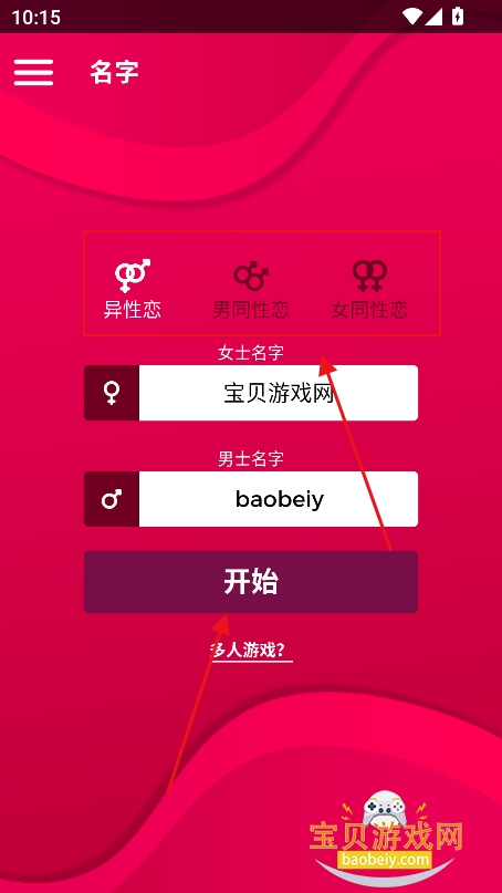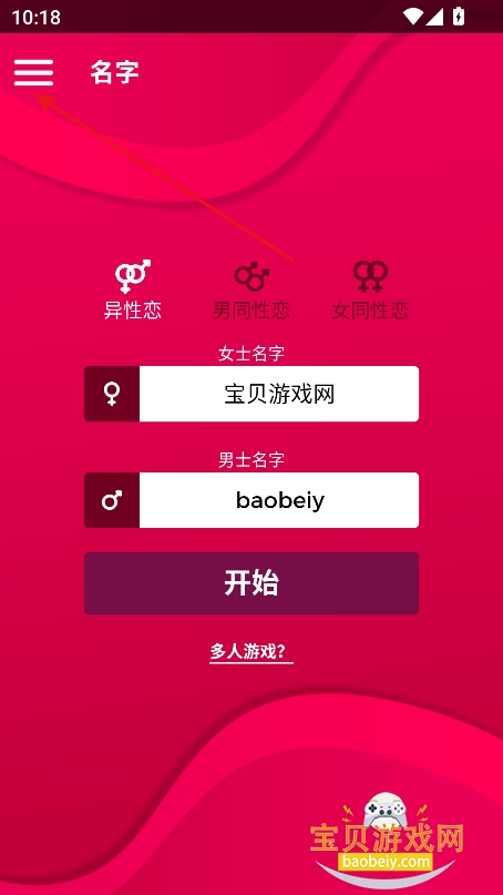 3、选择你的恋爱方式,如果选择异性恋,输入你和他的名字,点击开始游戏,也可以点击多人游戏