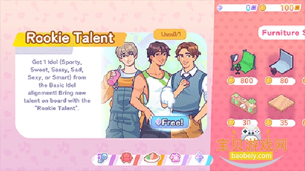 3、进到页面后,点击“free”雇佣第一位实习练习生,你作为他的新经理,需要帮助他发光发亮。