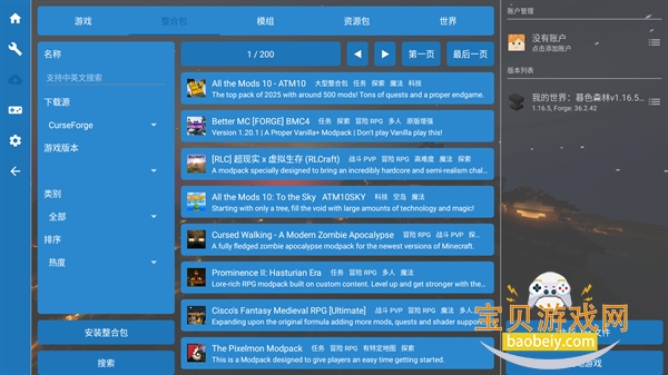 5.在左侧列表中点击第三个选项,在这里玩家可以看到上百种不同的游戏版本以及各种模组、整合包,应有尽有;