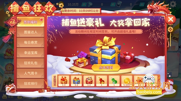 3、捕鱼狂欢,活动期间进行签到,领取超值礼盒。