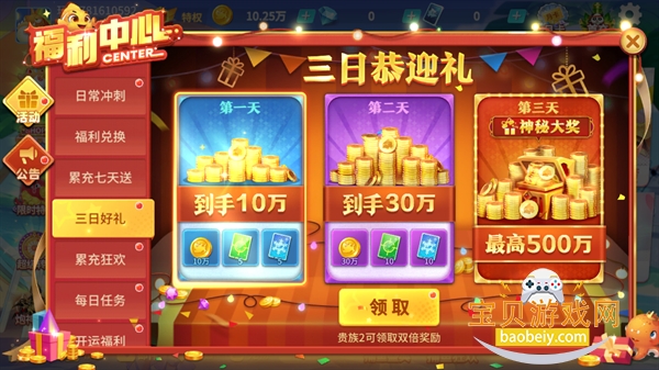 3、新手福利:新手玩家进入游戏后,可以领取新手7日礼包,快速成长。