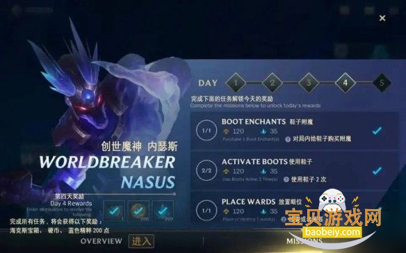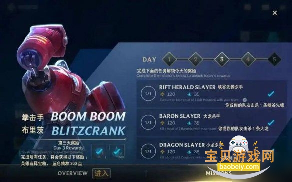 二、奖励内容:完成所有任务,将会获得以下奖励:英雄选择宝箱、蓝色精粹200点。