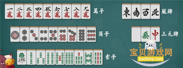 麻将一共有34种牌,分为5类:万子,简子,索子,风牌,三元牌。每种牌有4张,总共136张。