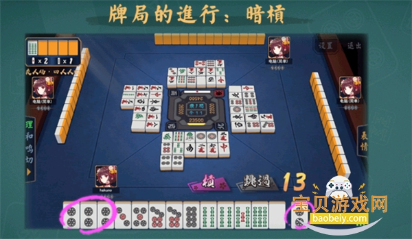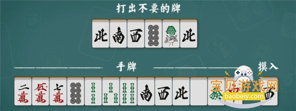 对局时,每个人手里常有13张牌,每回合摸1张组成14张,后打出一张。随著不断地摸入和打出,手牌将会不断变化。