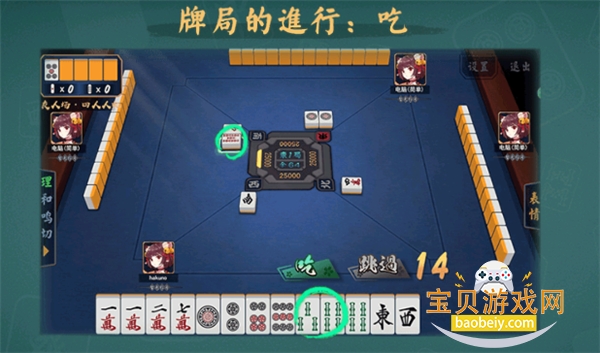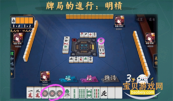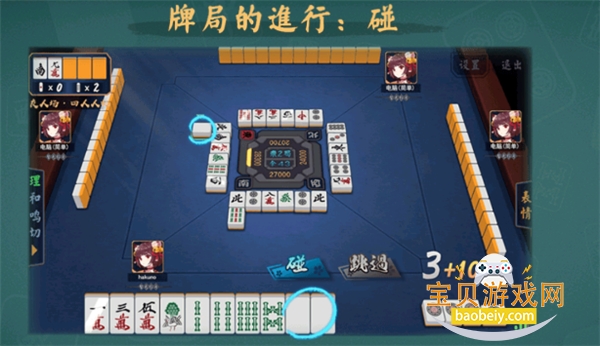 如果任意一个人打出了一张与你手牌中的对子相同的牌,可以选择点击【碰】将牌碰过来,连同手中的2张一起,摊开放在旁边。和吃一样,你也需要打一张牌出去。