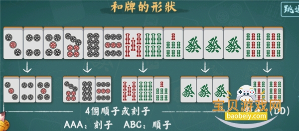 通常情况下,当自己的手牌形成了4个(顺子或刻子)+1个对子,就组成和牌形。