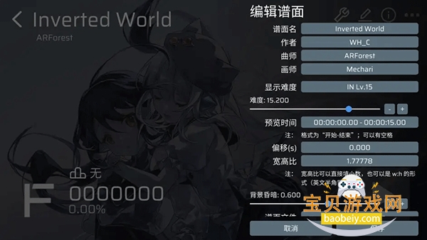 点击铅笔图标,屏幕右边出现谱面设置界面,这里可以调节谱面定数,宽高比和Tip等,请自行调节(记得保存)