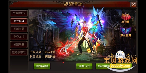 8、每晚20:00点还将有罗兰庆功盛宴,由罗兰城主开启,吃庆功宴的所有玩家将获得相应的奖励,庆功宴结束后盟主也将获得丰厚的庆功宴结束奖励,奖励以邮件形式发放至盟主账号。