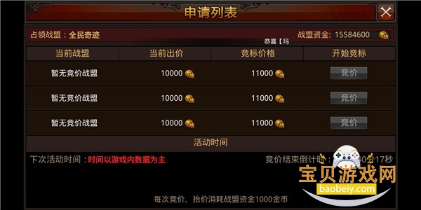 3、城战申请方法:活动城战申请,战盟盟主点击人物头像,在游戏界面上当找到战盟,从战盟点击进入战盟活动→罗兰城战,右下角城战申请,进入点击竞价申请城战,竞技城战有限制时间,关注一下申请列表的右下角的竞价结束倒计时,请在竞价结束前完成竞价。