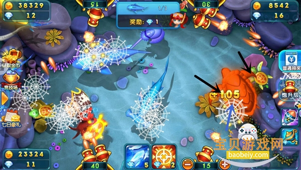 学会区分鱼种,也是一个很重要的捕鱼技巧。波克捕鱼中的鱼可分为三大类,灵活游动类的小鱼,如灯笼鱼等、拥有硬硬外壳的乌龟一类、和体型巨大的高分鱼,如黄金鲨等。小鱼一般打头尾是行不通的,一定要打鱼身;而乌龟则不同,头部和中间的龟壳相当坚硬,短小的四肢和尾巴才是它最脆弱的地方;还有大鱼,一定要记得打鱼鳃,而且炮台的级别不可小于400。