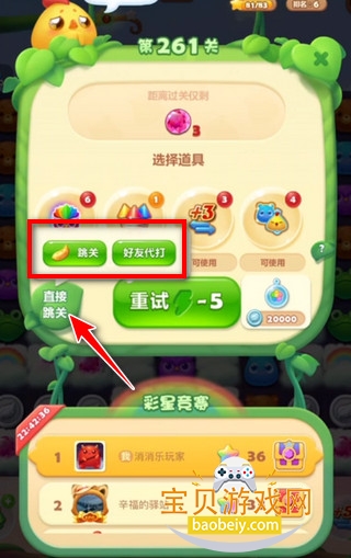 8、然后在失败的时候,就可以看到重试的左边出现“直接跳关”的按钮,再点它一下就可以选择好友代打了!
