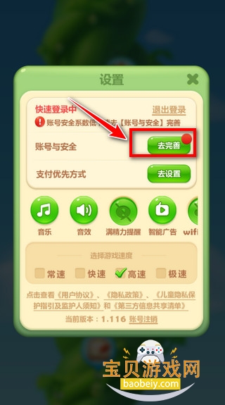5、在开心消消乐的设置中,选择“账号与安全”一项,点击去完善