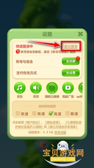 2、在开心消消乐的设置中,选择“账号与安全”一项,点击退出登录即可切换账号