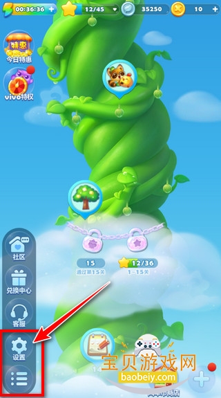 4、现在教大家如何绑定微信或者QQ账号,来到开心消消乐主页面之后,我们点击左下角的菜单图标选择设置
