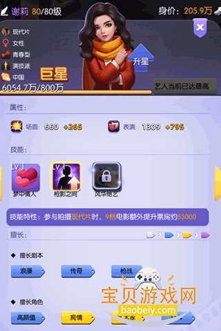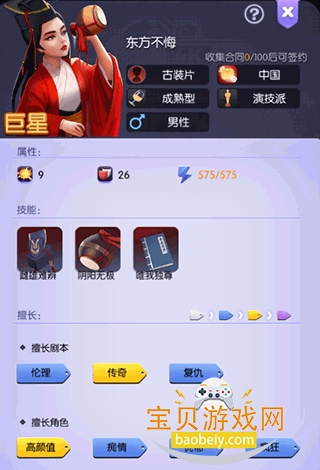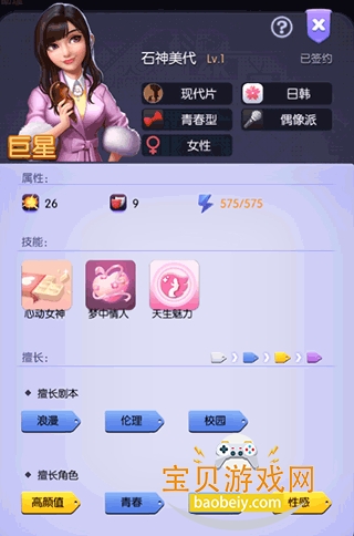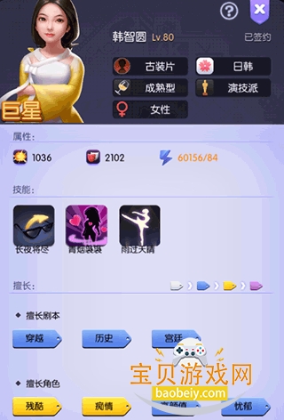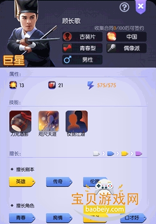 身为一张可以在“钻石星探”可以抽到的巨星,获取难度会相对比较低一点,该艺人擅长角色与剧本比较偏,一般在现代与古装偏兼容率会较高一点。