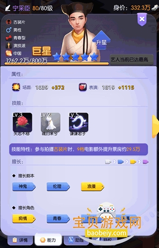 该艺人1技能可兼容“古装剧”,2技能可兼容“战争剧”。
