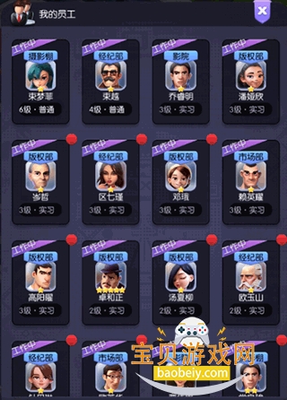 员工分为:1-5星,摄影棚-市场部-版权部-经纪人-影院(总裁办公室和星探无法直接招募)