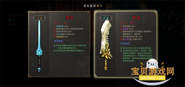 玩家在武器池子中可以获得随机武器,池子背后散发的光芒颜色则代表了武器的稀有度。武器稀有度由低到高依次是蓝色精良、紫色史诗、金色传说和红色绝世。