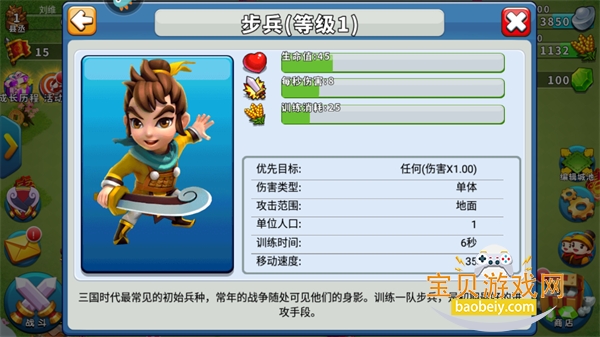 三国时代最常见的初始兵种,常年的战争随处可见他们的身影。训练一队步兵,是初期最好的进攻手段。