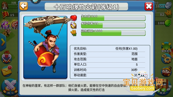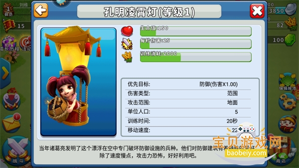 当年诸葛亮发明了这个漂浮在空中专门破坏防御设施的兵种。他们对防御建筑有着特殊的爱好,除了速度慢点,攻击力恐怖,好好利用吧。