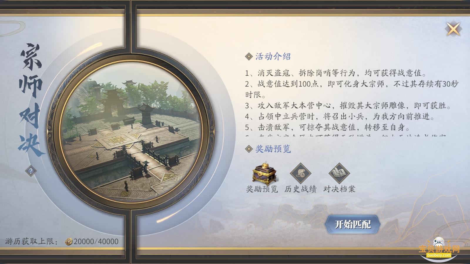 匹配成功后,玩家将随机被分配到一方阵营,并随到一位宗师(四顾剑、苦荷、叶流云、庆帝)在本次对战中助战。不同阵营将随机到不同的宗师。击败对方宗师雕像的一方将获取比赛胜利。在击败宗师雕像前,必须攻克任意一个城门,否则将没有办法进入至敌对区域。