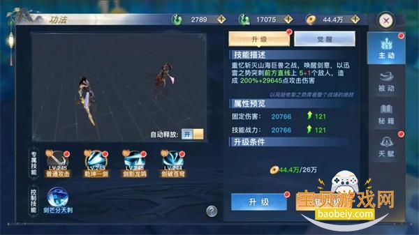 技能升级:可使用铜钱对技能进行升级。一键升级功法将按顺序平均升级,当铜钱不足或技能升至当前最高级时自动停止。