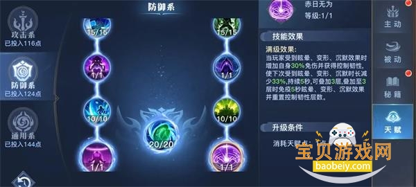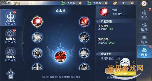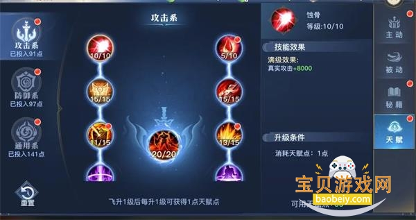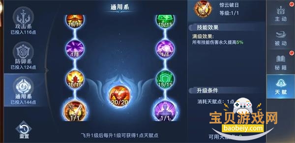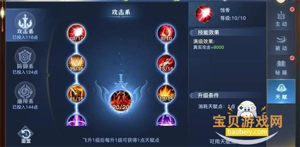 天赋点可对攻击、防御、通用系类型天赋进行加点,越往后的天赋加点有前置条件;