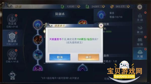 合理分配天数点数可获得更高的属性加成,且天赋点数支持重置,但需要注意进行天赋重置是需要消耗天赋重置书(消耗150绑玉或者仙玉)的哦。