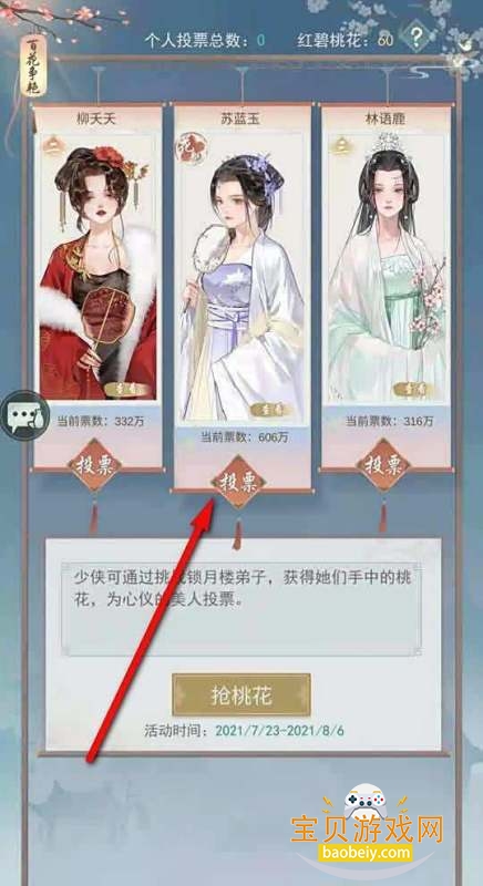 选择投票对象:在“百花争艳”页面中,找到“柳夭夭”、“苏蓝玉”及“林语鹿”三位候选角色,点击其对应的“投票”按钮。