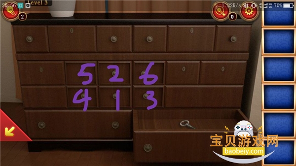 点击⑥处,组合把手和胶水,安在2号抽屉上,按顺序点击,打开右下角抽屉得到一把钥匙