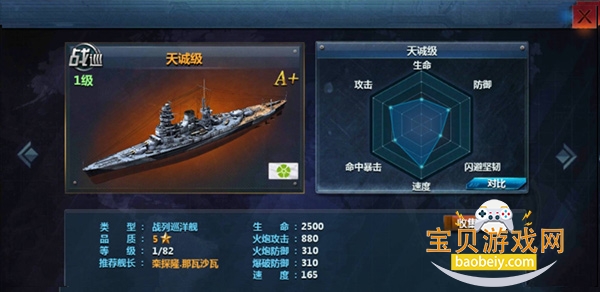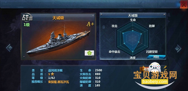 6、第六艘推荐的是天城级战列巡洋舰,天城级165的速度不愧于巡洋舰的称呼,是阵容中速度最高的。技能可以对前排造成火炮伤害。