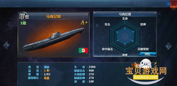 4、第四艘推荐的是马肯尼级潜艇,马肯尼级和CO35一样,速度非常低,优点是其余属性非常平均,几乎是一个正六边形,技能鱼雷潜射可以对后排造成大量爆破攻击。