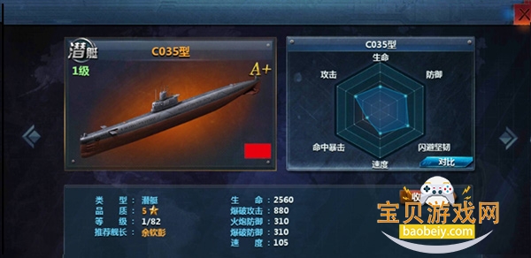 3、第三艘艘推荐的是C035潜艇,潜艇和航母一样同为爆破伤害,C035属于A+级,技能可以随机3个目标造成伤害。优点是防御强,火力猛,缺点是速度慢,命中低。在我们这个阵容里,芸龙级为其增加了命中,塞班级增加了速度,可以说把C035的缺点全部弥补了,非常搭配。