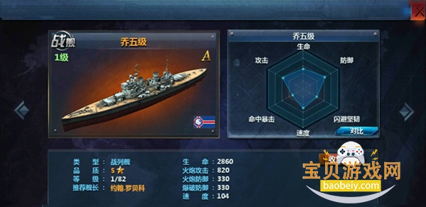 8、最后一艘战舰我们要加强点杀伤害,在以上出战的舰船中,随机多目标伤害、后排伤害和前排伤害都已具备,可以保证火力全覆盖,唯一缺少一艘点杀能力强的舰船。推荐选择乔五级战列舰,乔五级火炮攻击不俗,技能可以对敌方单体造成海量伤害。在上阵时安排在最后出手的位置,可以保证一发带走敌人一条舰船。