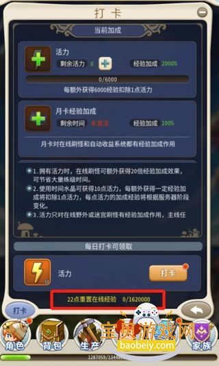 55月卡V1贵族:每日在线挂机经验是有限额的,在左上角打卡页面的地步可以查看额度,建议时间水晶每天买满,通过挂机把限额挂满,离线经验水晶也要吃满,28级之后记得要加入家族,在家族页面进入酒馆每天都是可以吃经验了,发现很多新人都不知道,主线必须做满基本就能跟上第一梯队了。