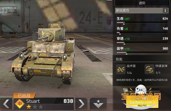 (4)对于喜欢连杀的指挥官,建议你选择【Stuart】,该坦克有快速填弹技能,当子弹用完时,可迅速补充,可以满足击杀多辆坦克的机会,战术链可对友军进行治疗,对敌军造成每秒造成%伤害,配合爆发力强的特点,成为全场亮点。