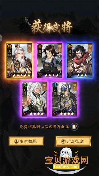 过完剧情之后,会出现第一次五连抽,可以尽情大胆的抽,一开始的五连抽会保底有一张橙卡,可以不停重置,抽到自己想要的卡为止。建议选择技能可以回血或者减伤的将领,减少前期开荒的战损,避免拖慢开荒速度。