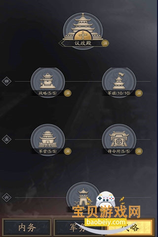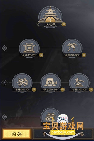 城池的内政相当于一个庞大的修炼系统,通过消耗石料、木材、铁矿进行升级,可以全方位综合提升主公的国土实力,玩家可以根据自己的玩法节奏对内政中的子系统升级