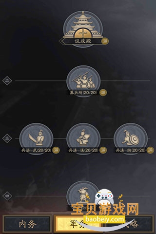 内政的核心大本营,升级可以提升城池耐久和统御值,兵器能解锁更多的内政。一般来说武将稀有度越高,带领部队所需的统御值越高,提升议政殿的等级可以让自己的部队带更多更好的武将,在议政殿7级之后可以通过研究统御来提升部队统御值。