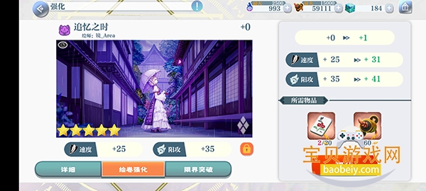 绘卷的提升主要有绘卷强化和界限突破这两种方式。绘卷强化满后才需要进行界限突破,绘卷的强化需要消耗一定数量的强化材料,不同的卡牌所需要的材料不同,主要分为兰、梅、竹、菊四个大类的不同分页的材料,同时还需要消耗一定数量的赛钱。