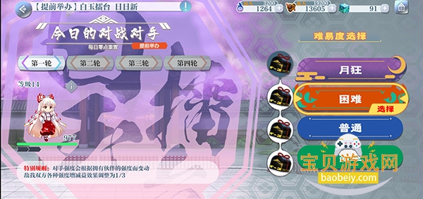 主线任务完成到第一章节的第五小节后,就能在游戏首页的特殊选项中进入选择白玉擂台进入到擂台页面。在白玉擂台中会显示今日的对战选手,同时可以进行难度的选择,简单档次的对手显示325的战力,普通781,困难977,月狂2687,但是这个战力显示并不是我们自己编队页面显示的战力那边计算的。